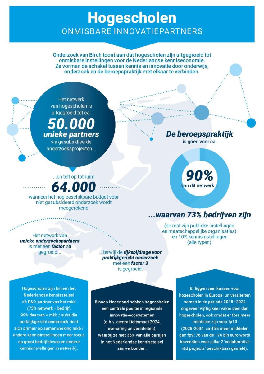 The VH advocates for additional structural funding for universities of applied sciences, so that they can meet the growing demand from large and small(er) businesses, civil society organisations and public institutions. Applied research is a powerful driver of innovation, productivity growth and regional development. Through their research, universities of applied sciences deliver directly applicable innovations. Additional funding gives universities of applied sciences the scope to increase their contribution to economic development and to ensure that knowledge flows back into education even more quickly.Of the 64,000 partners, around 50,000 are unique. The professional sector accounts for 90 per cent of the network, with 73 per cent being businesses. The remainder are public institutions, civil society organisations and knowledge institutions. For further figures, see the infographic below