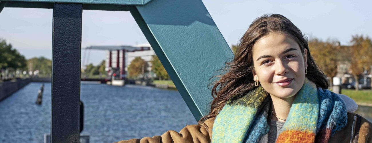A female international student with her bike and backpack at the HZ University of Applied Sciences in Middelburg, Zeeland, The Netherlands.