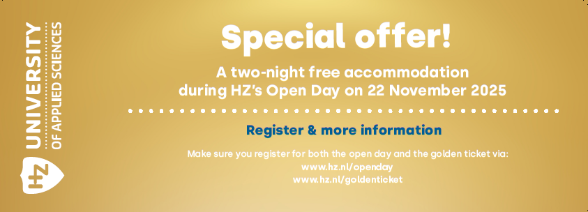 We will organise dinner on Friday and lunch on Saturday. The "Golden Ticket" will only be valid for you when you show proof of your flight, bus or train ticket by sending a copy to study@hz.nl. There is limited capacity in tickets, so first-come, first-serve!