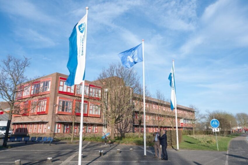 Deze week hebben Hendrik-Jan van Arenthals en Richard Liefting, voorzitter en lid College van Bestuur, symbolisch de vredesvlag gehesen. Deze vlag is een internationaal symbool voor vrede, verbondenheid en geweldloosheid.